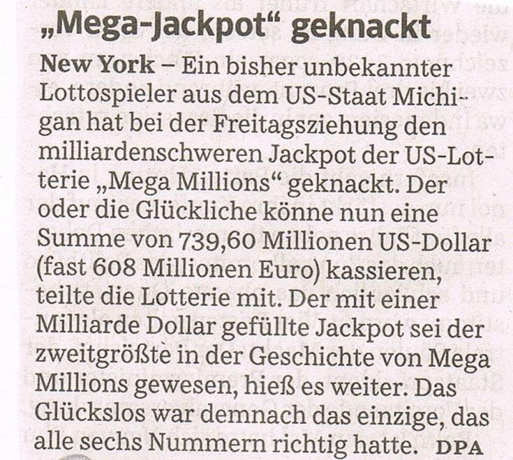 Und was ist gar mit einem bisher unbekannten Lottospieler aus dem Staat Michigan, der in der Freitagsziehung am 22. Januar 2021 den Jackpot der Mega Millions gewonnen hat und 739 Millionen US-Dollar erntete (das sind 608 Millionen €uro). Sein (oder ihr?) Glückslos war das einzige mit allen sechs richtigen Nummern.