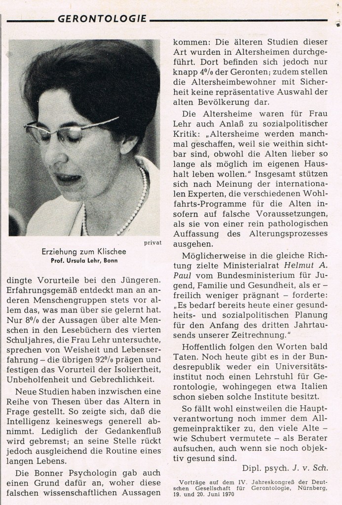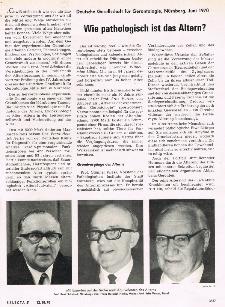 Dazu fiel mir ein – dass ich zufällig vor fünfzig Jahren einen Kongress der „Deutschen Gesellschaft für Gerontologie“ im Juni 1970 besucht und darüber in einer medizinischen Fachzeitschrift berichtet habe.