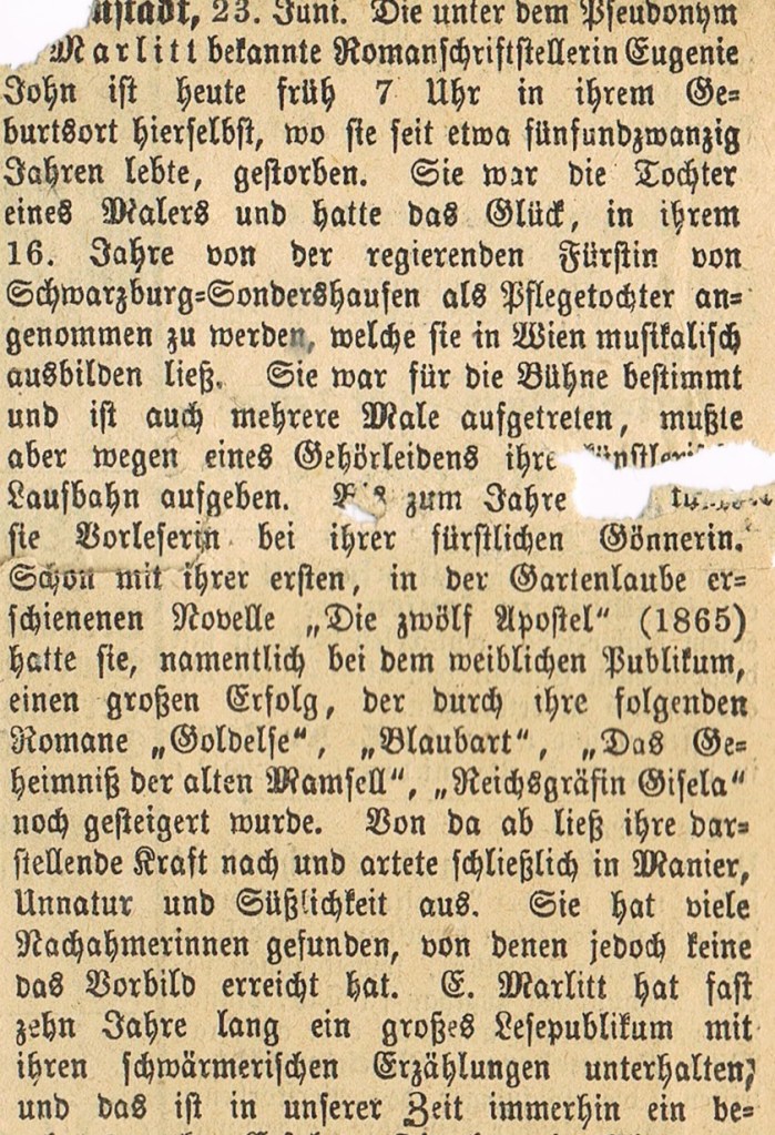 Das Schicksal der Marlitt hat Ferdinand Naumann nicht zuletzt wegen seines angedeuteten schriftstellerischen Ehrgeizes beschäftigt. An einer Stelle im Tagebuch (s. ganz oben) überlegt er, einer Frauenzeitschrift einen eigenen Beitrag zu schicken.