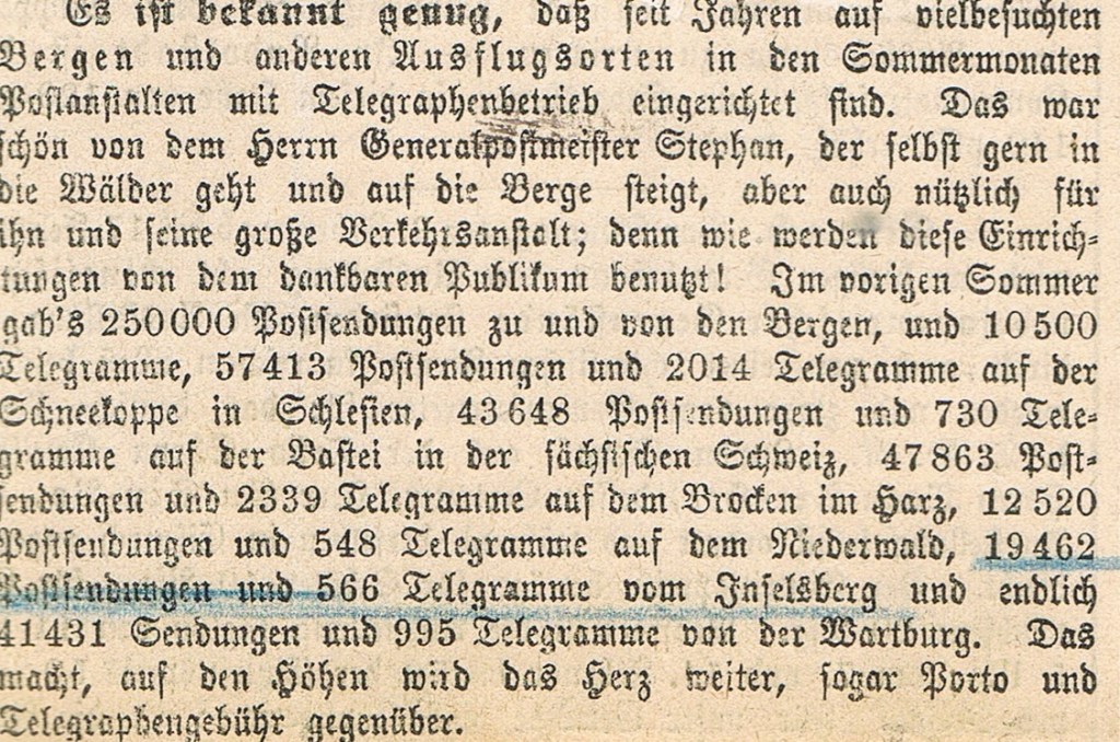 Über meinen Urgroßvater Ferdinand Naumann habe ich schon an anderer Stelle berichtet, desgleichen über seine Bildungsreise an die Riviera anno 1908 und über seine Frau Anna und deren aufschlussreichen Brief. Hier mache ich ein Kapitel aus seinen Tagebüchern zugänglich, das sich streckenweise wie Szenen aus einem Abenteuerroman liest. Man erlebt ihn nicht nur als einen begabten Schreiber (mit Ehrgeiz – s. Schluss dieses Beitrags), sondern erfährt dabei auch, wie es vor mehr als hundert Jahren zuging, als es weder Autos noch Telefon gab und der Bau einer Wasserleitung und einer Telegrafenleitung hoch zum „Hotel Gotha“ auf den Inselsberg noch Sensationen waren.