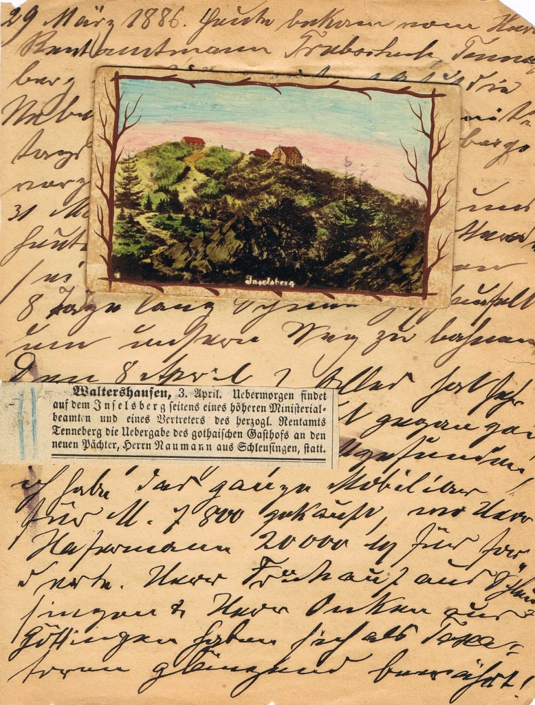 Dieser 29. März 1886 war der Beginn eines Abenteuers mit ungewissem Ausgang: Die Übernahme eines Ausflugslokals und Hotels auf dem Inselsberg. Das folgende Transkript beschreibt die Schwierigkeiten bei dem Fortgang dieses Abenteuers am Ende des Jahres 1886. Rechtschreibung und „Fehler“ wurden belassen, wie sie im Tagebuch stehen – es gab 1886 zwar schon, ab 1880, den Duden – doch so etwas wie eine „verbindliche Rechtschreibung“ musste sich erst noch durchsetzen.