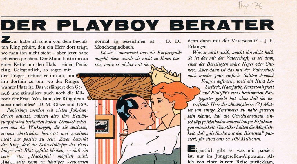 Durch das Interview mit Hans Bender, dem Freiburger Parapsychologen, das ich mit Hans Hartl (alias „Philip Vandenberg“) damals machte, war der Kontakt zum Playboy geschaffen. Das Interview wurde nicht gedruckt (wg. massiven Änderungswünschen von Bender), dafür kam 1975 von Redakteur Niklas Frank der Auftrag für die Beantwortung von Leserbriefen (von denen jedoch etliche getürkt waren), zum Stückpreis von DM 150. Mark.