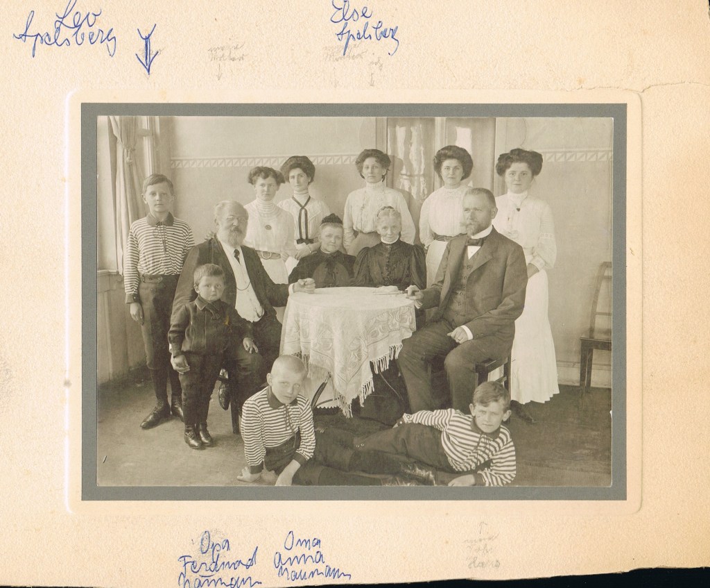 Wer sind die übrigen Personen? Das dürften weitere Mitglieder der Familie Spelsberg gewesen sein: In der mittleren Reihe (also meine Urgroßeltern-Generation) wohl die Urgroßmutter Spelsberg und daneben ihr Mann. Aber über diese Linie (und die übrigen Personen auf dem Bild) weiß ich nichts außer dem über Leo berichteten (Quelle: Mein Vater, der Leo wohl sehr schätzte – kein Wunder nach diesem „Volltreffer“ mit dem Horoskop).