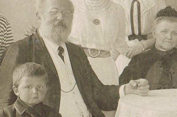 Wer hat die handschriftlichen Hinweise auf dem Bildrand angebracht? Das dürfte mein Vater gewesen sein, schon wegen der Diktion „Opa Ferdinand Naumann“ bzw. „Oma Anna Naumann“. Ich spekuliere mal, dass er der etwa dreijährige Junge ist, der sich vor dem (seinem) Großvater Ferdinand an diesen schmiegt. Der Familienüberlieferung nach wurde mein Vater als Siebenjähriger (also 1914) wegen der zunehmend schlechten Versorgung der Bevölkerung von Hagen (wo die Familie lebte) zu den Großeltern auf dem Inselberg geschickt, die mit ihrem Gastronomiebetrieb eher an Nahrung kamen als andere Leute. Wenn diese Vermutung zutrifft, dürfte das Bild 1910 aufgenommen worden sein – als mein Vater etwa drei Jahre alt war.