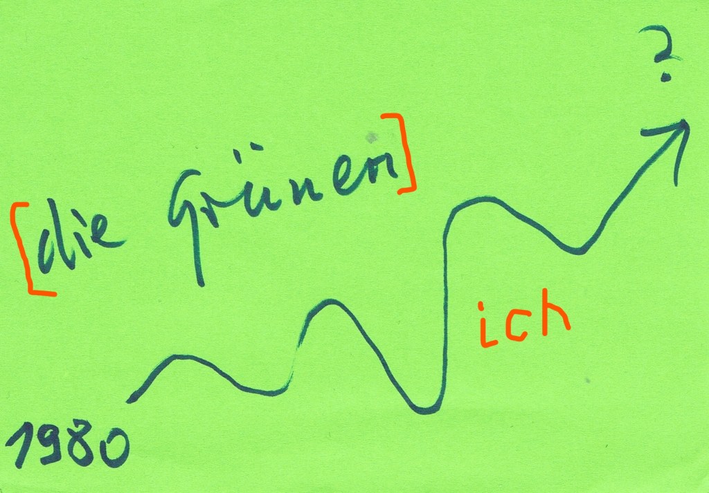 Aber meine allererste Wahl, an die ich mich erinnern kann, war 1964 die SPD – nicht zuletzt durch den Einfluss meines Vaters, aber auch dank einer eindrucksvollen Rede von Willi Brandt in Nürnberg unter der Burg. Sobald 1980 die Grünen auftauchten, an deren → Gründungsphase ich sehr aktiv dabei beteiligt war, wählte ich diese neue Gruppierung. Als die mir jedoch zu „links“ wurde (= dogmatisch und extrem kapitalismuskritisch), engagierte ich mich eine Weile bei der ÖDP (immer unbedeutend in Bayern – aber mit der großen zivilisatorischen Leistung, das Rauchverbot in öffentlichen Einrichtungen initiiert und erfolgreich durchgesetzt zu haben).