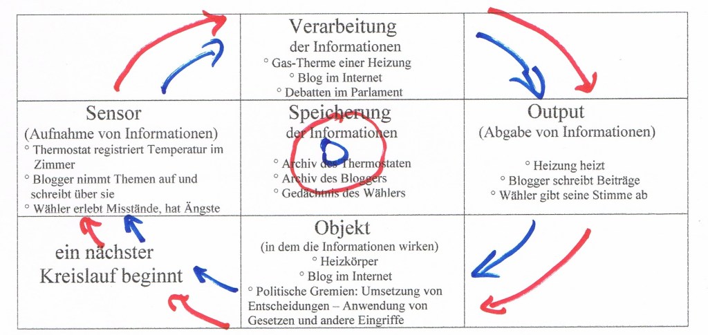 Kybernetische Kreisläufe regulieren sich selbst (über die Sensoren) und reagieren ausgleichend auf Störungen. Auf diese Weise bleibt ein Dynamisches Fließgleichgewicht erhalten.