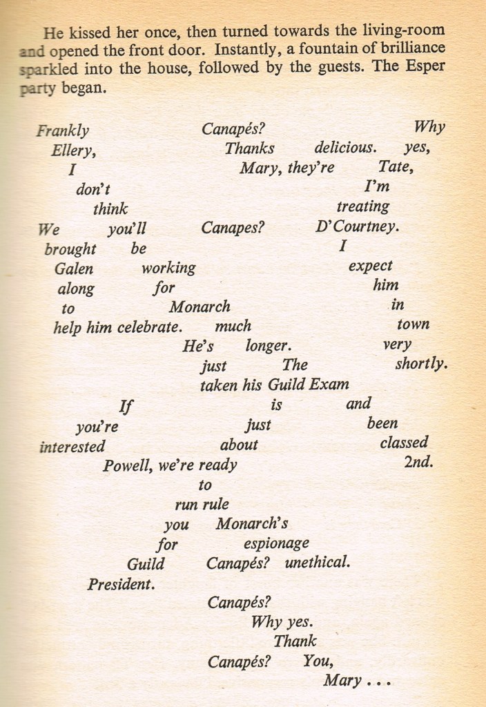 Und so sieht das in Alfred Besters Roman The Demolished Man aus, wenn sich Telepathen auf einer Esper-Party unterhalten: