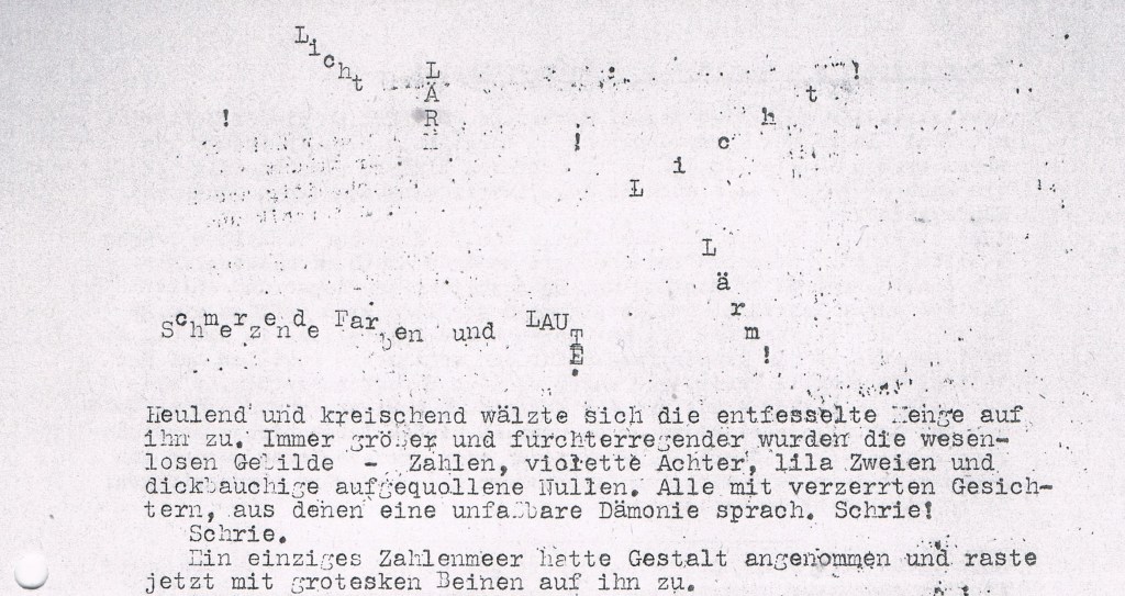 Dies ist eine erste Annäherung an mein zweites Buch – ausgelöst von meinem Beitrag zum C. C. Rider. Die darin erwähnte und mit einem kurzen Kapitel gewissermaßen „vorveröffentlichte“ Science-Fiction Sternvogel war der erste Anlauf zu meinem zweiten Roman. Was ich da im November 1958 in die Erika meines Vaters hämmerte, war inspiriert von den graphischen Experimenten des Autors Alfred Bester in seinen Romanen The Demolished Man und Tiger! Tiger!, die im amerikanischen SF-Magazin Galaxy in den 1950er Jahren als Serials erschienen sind.