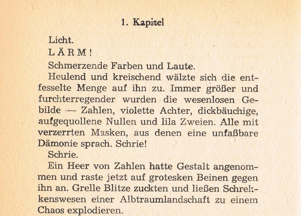 In der gedruckter Ausgabe hat ein übereifriger Setzer diesen wilden Anfang brav linksbündig geordnet – was ich leider erst bemerkte, als das fertige Leihbuch vor mir lag.
