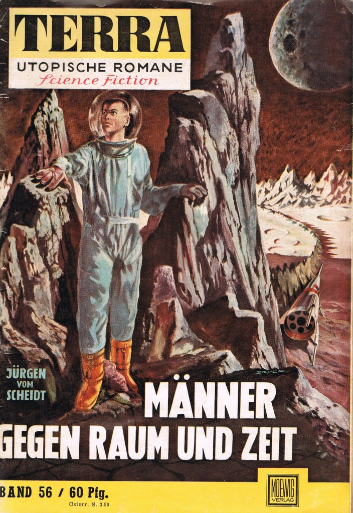 Solche „Leihbücher“, die man nur in speziellen „Leihbüchereien“ bekam, waren eine typische Erscheinung der Nachkriegszeit mit ihrem Hunger nach erschwinglicher Literatur. Ihr Ende kam Ende der 1940er Jahre, als der Rowohlt-Verlag erst seine billigen „Rotationsromane“ im Zeitungsformat auf den Markt brachte und dann mit dem aus Amerika importierten Taschenbuch-Format Furore machte. Interessanterweise war eine der ersten Ausgabe von „RoRoRo“ ein Zukunftsroman: Die Zeitmaschine von Herbert George Wells. Sie hat heute noch einen Ehrenplatz in meiner Bibliothek – nicht als (deutsche) Erstausgabe von 1951, aber immerhin aus der Folgeauflage (51. bis 63. Tausend) von Oktober 1956.
