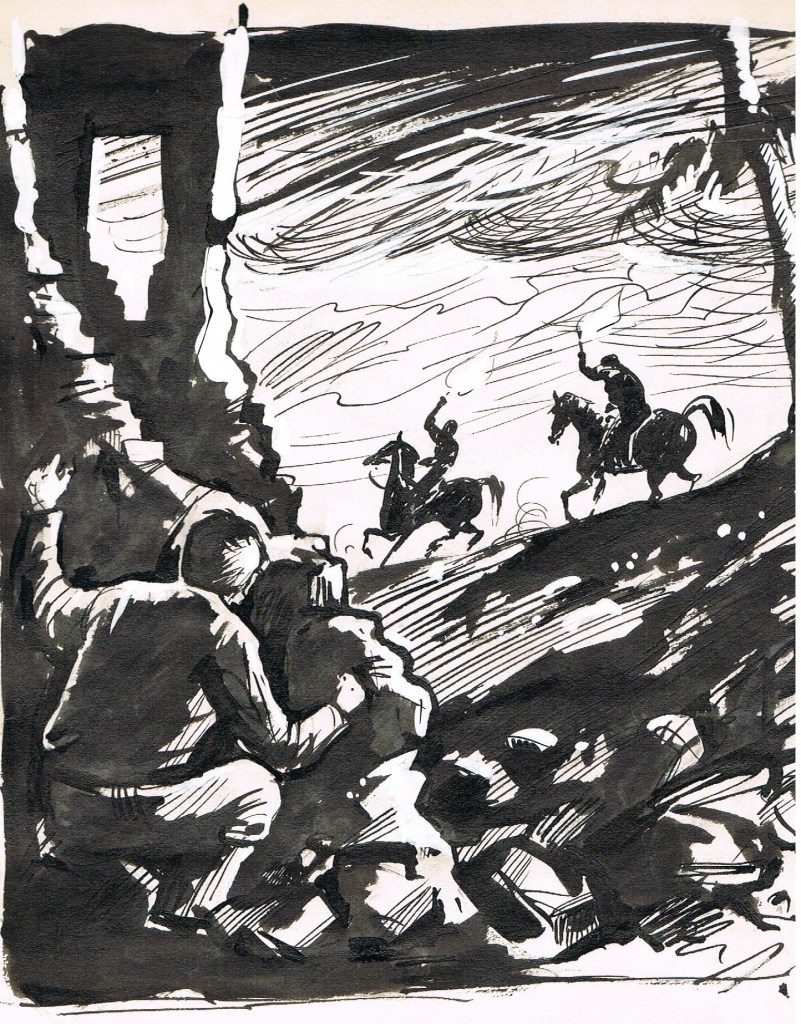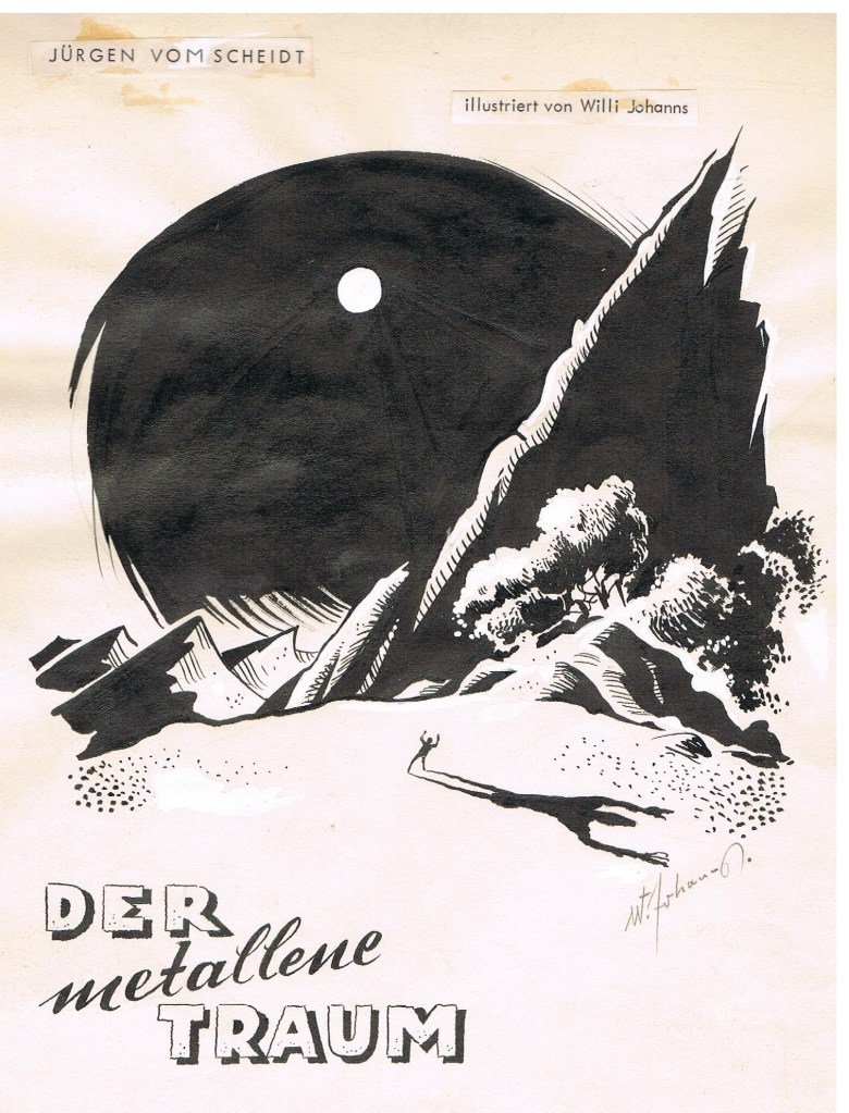 (Die Zeichner, die damals in Kaukas Wohn- und Arbeitsvilla in Geiselgasteig am südlichen Rand von München malochten, stammten aus Jugoslawien – die Entwürfe von Willi Johanns, früher mein unmittelbarer Nachbar in der Heßstraße, hatten leider keine Gnade beim Herausgeber gefunden – schade, denn Willi hatte ursprünglich den Kontakt zu Kauka vermittelt. Im selben Jahr hatte er einige atmosphärisch dichte Illustrationen zu meinem dritten Roman Der geworfene Stein angefertigt, der zunächst im SF-Fanzine Munich Round Up vorabgedruckt wurde – s. Abb. 4, 5 und 6).
