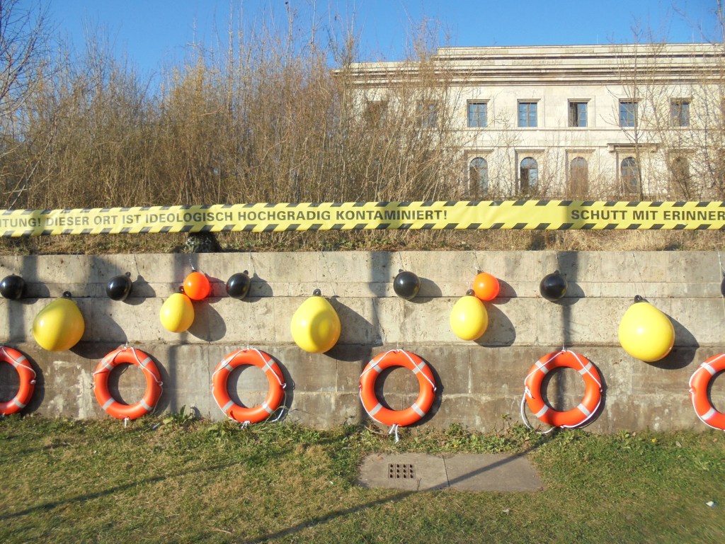 Der wild überwucherte Rest des Ehrentempels (Mitte) soll nun mit seinen etwas rätselhaften Luftballons und den symbolischen Rettungsringen daran erinnern, was Putin uns aktuell vor Augen führt: „Das Böse ist immer und überall“ (so der Refrain im Song „Ba-Ba-Banküberfall“ von 1986 der österreichischen Kult-Band Erste Allgemeine Verunsicherung).