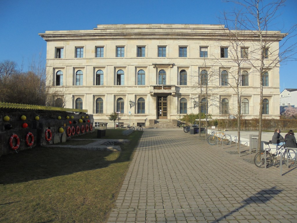 Ein Bericht im Lokalteil der SZ hat auf diese Installation aufmerksam gemacht. In meiner Nachbarschaft, hier in der Maxvorstadt München, haben sich die Nazi während des Dritten Reichs in ihrem Größenwahn am liebsten breitgemacht – zwischen Feldherrnhalle und Königsplatz. Siebzig Jahre hat es nach Kriegs- und Nazi-Ende gedauert, bis sich München, die einstige „Hauptstadt der Bewegung“, dazu durchringen konnten, endlich 2015 das NS-Dokumentationszentrum (linkes Bild) zu eröffnen, das an den NS-Terror und den Größenwahn seiner Rädelsführer und Handlanger erinnert, speziell in Bayerns Landeshauptstadt. Das passt bestens zum noch immer existierenden „Führerbau“, der nach dem Krieg zur „Staatlichen Hochschule für Musik“ umfunktioniert wurde (rechtes Bild).