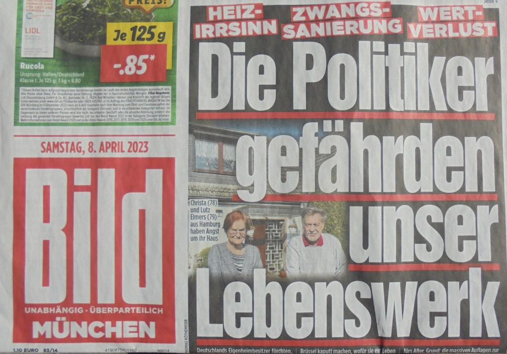 NN: „Die Politiker gefährden unser Lebenswerk“. BILD-Zeitung vom 08. April 2023, S. 1 (Aufmacher).