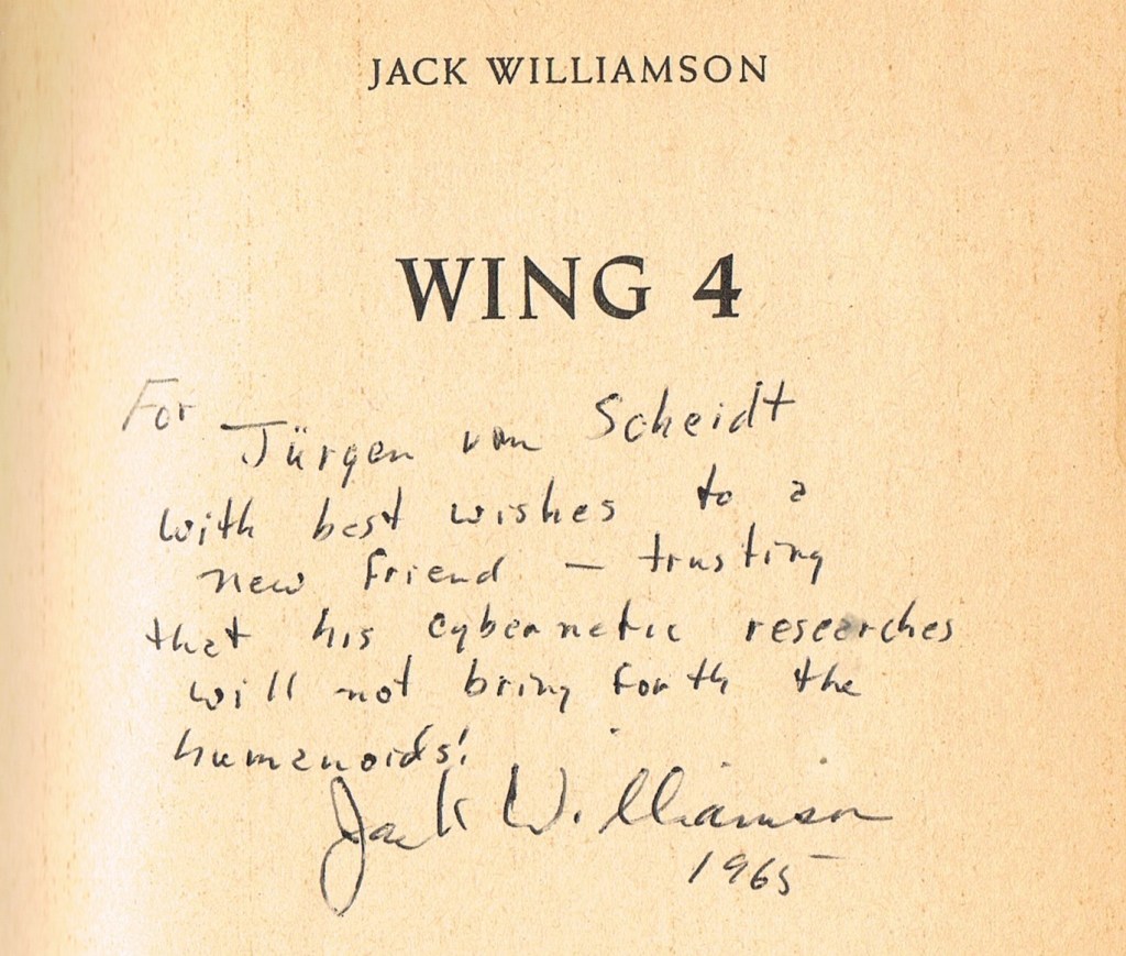Als Jack Williams 1965 bei mir in München zu Besuch war, bat ich ihn, mir eine Widmung in die deutsche Ausgabe Wing 4 seines Romans The Humanoids zu schreiben (s. Abb. 3). Er endete diese Widmung mit: “ – trusting that his cybernetic researches will not bring forth the humanoids!“ Muss man, glaube ich, nicht übersetzen.