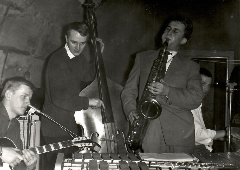 Bild 4: Alfred Hertrich (Gitarre) mit Werner Weinelt (Bass) und Uwe Brandner (Saxophon) 1965 im Jazzstudio Nürnberg (Archiv JvS – Fotograf unbekannt)