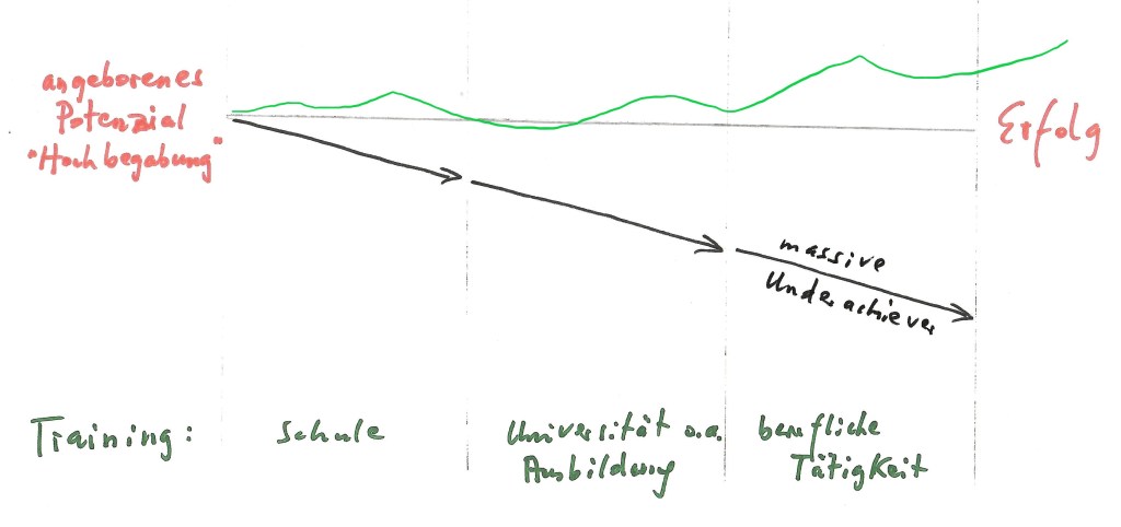 Aber Vorsicht: eine steile Aufwärtskarriere ist nicht unbedingt typisch für Hochbegabte. Viele von ihnen scheitern sehr früh (schon in der Schule) oder haben sehr „krumme“ Lebensläufe. Ich schätze, dass